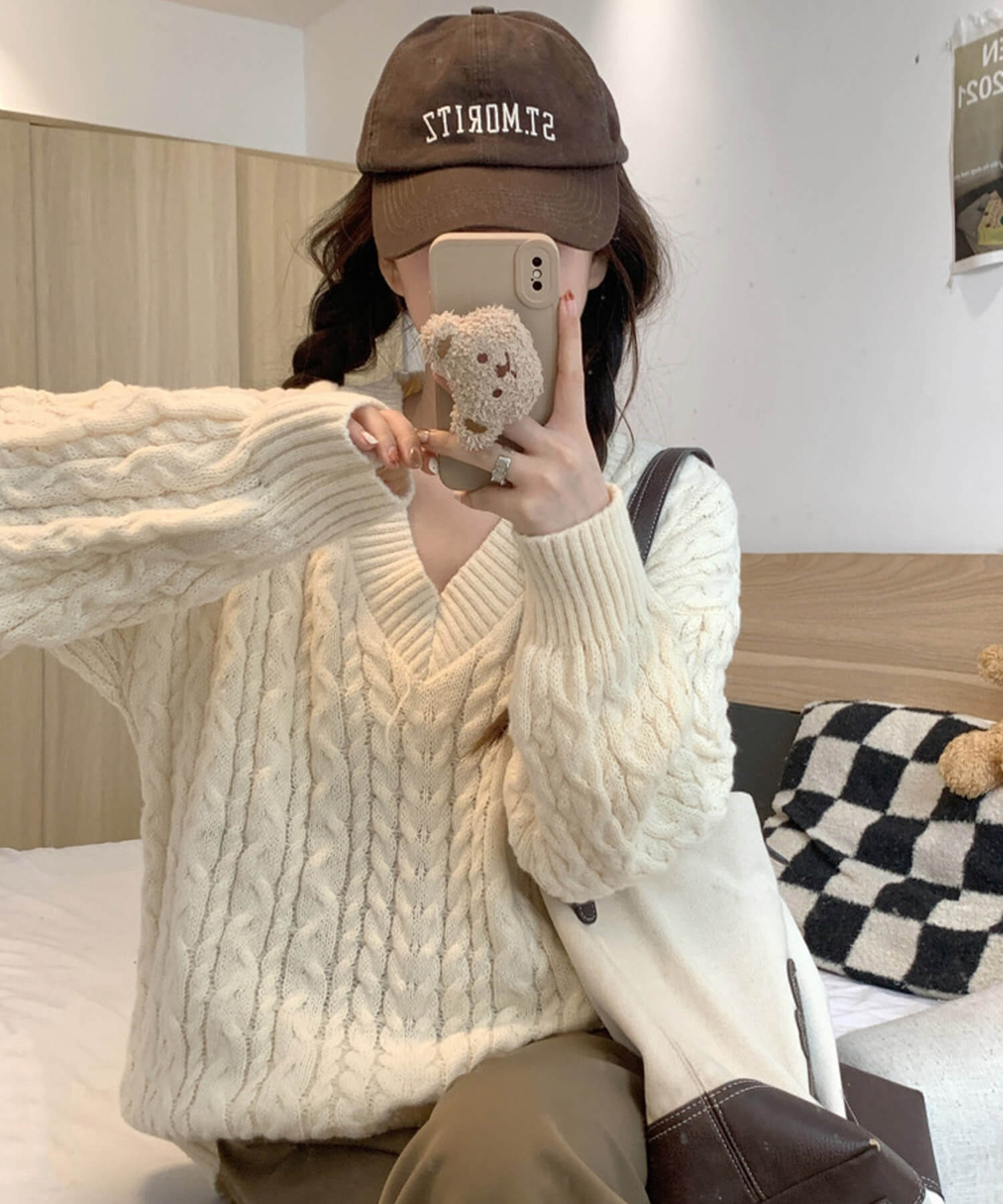Vネック ケーブル編みニット 【即納】 カラーニット 人気 レディース 韓国 プチプラ おしゃれ