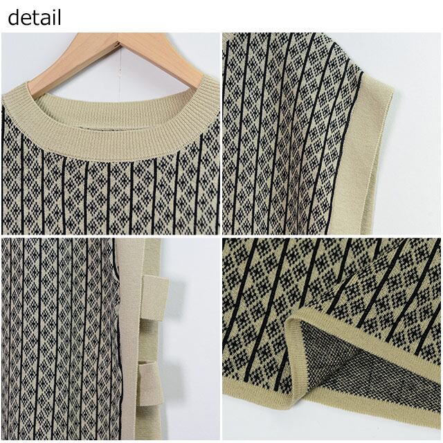 ジャガード柄 サイドオープンロングニットベスト 【即納】 レイヤード トレンド
