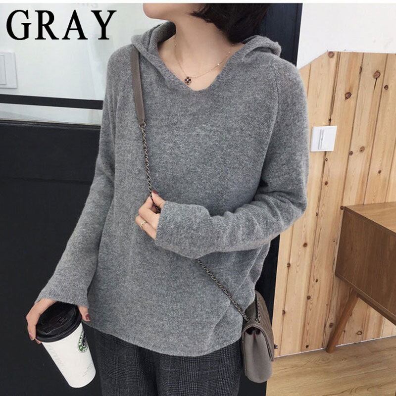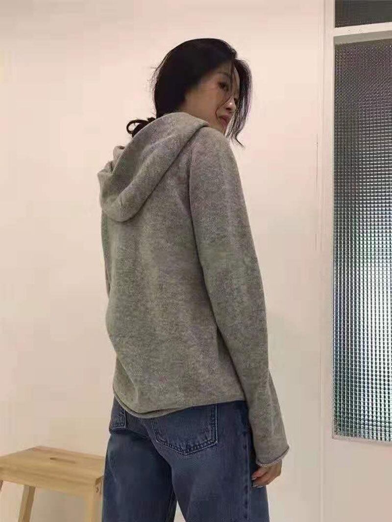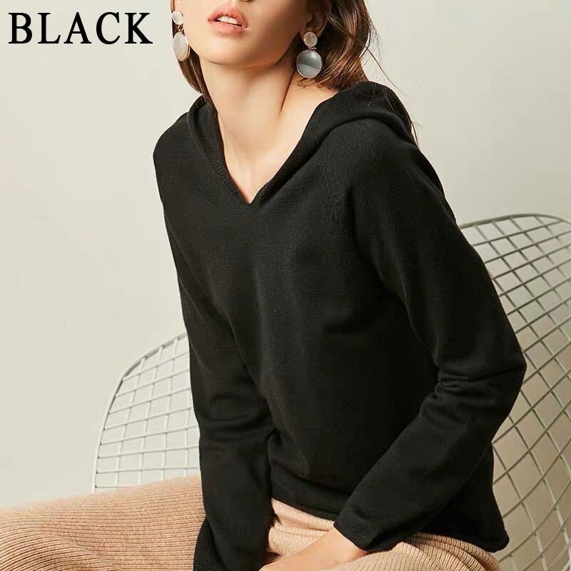 ニットブラウス ルーズシャツ フード付き Vネック 長袖 無地