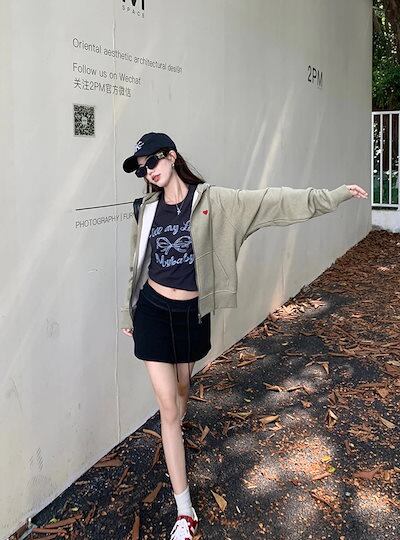 2024 秋冬アウター パーカー フード付き ジップ チャック 長袖 花柄 ポケット ハート 細見え 秋 緑 カーキ おしゃれ かわいい ガーリー キュート 甘め 韓国ファッション レディース お出か | OPEN-korea