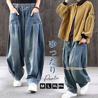 サルエルパンツ レディース デニムパンツ サーカスパンツ ウエストゴム ロングパンツ ガウチョ ワイドパンツ 体型カバー ゆったり カジュアル