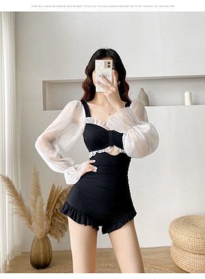 2色 水着 リボン モノキニ 透け感 キュート 華やか ラブリー ミニ ショート丈 フリル 可愛い 体形カバー ワンピース 大人 お姉さん スタイルアップ モテ レディース ブラック グリーン ブルー | OPEN-korea