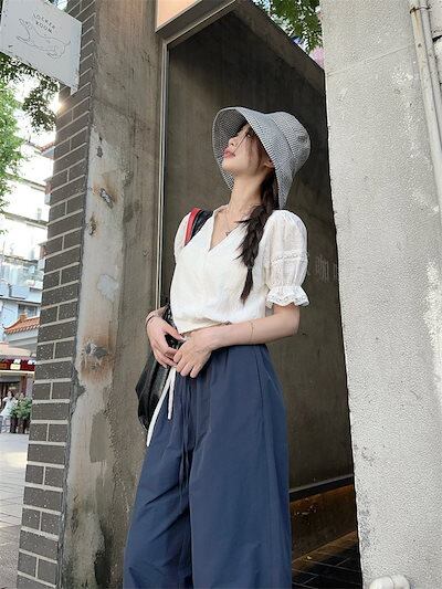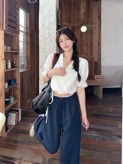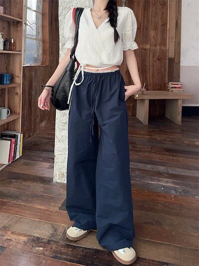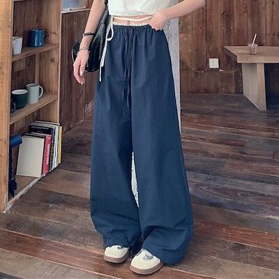 2024 春夏パンツ モップパンツ ロング丈 ワイド ウエストゴム ハイウエスト 美脚効果 脚長効果 細見え 夏 青 ブルー おしゃれ かわいい 韓国ファッション レディース お出かけ | OPEN-korea