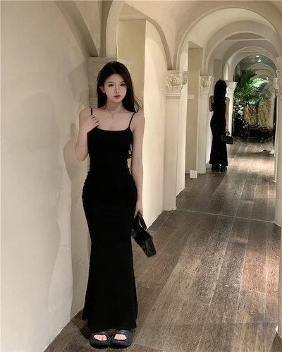 2024夏 韓国 ワンピース ロング丈 ゆったり Vネック キャミソール ハイウエスト フィッシュテールかわいい カジュアル おしゃれ 夏 ファッション フィッシュテールフレンチお出かけ