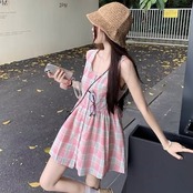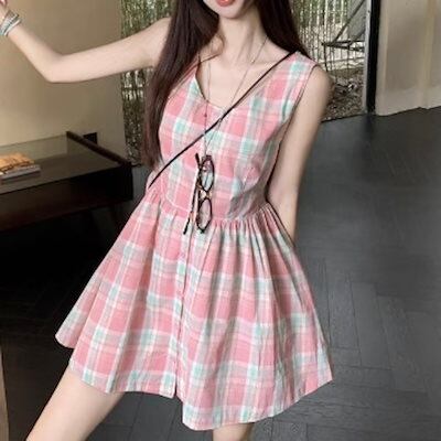 2024春夏ワンピース ミニ丈 Uネック ノースリーブ チェック柄 Aライン ゆったり 細見え 夏 ピンク おしゃれ かわいい ガーリー キュート 甘め 韓国ファッション レディース お出かけ | OPEN-korea