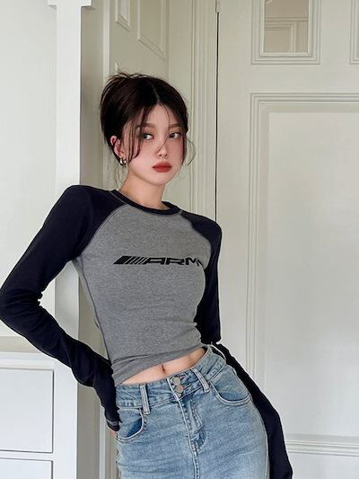 2024春夏 トップス 長袖 可愛い おしゃれ タイトフィット カットソー ラウンドカラー 重ね着丈 スリーブ 女っぽ レディース Tファッション系 フェミニン きれいめ 色っぽ プリント | OPEN-korea