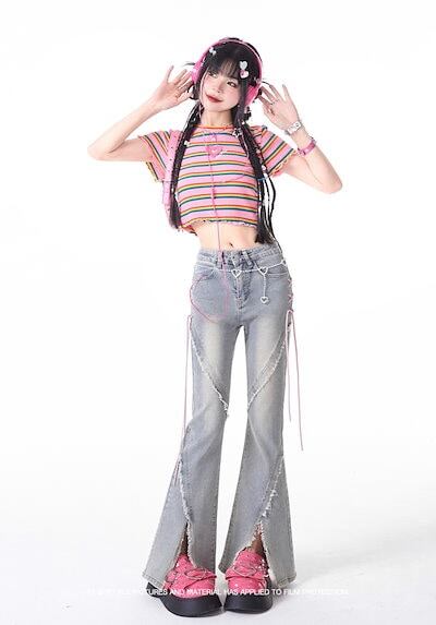 2024夏 韓国 デニムパンツ ボトムス ジーンズ ハイウエスト ファッション系ワイド スタイルサイド紐が付い ゆるダボ ジーンズ シルエット加工 レディース カジュアル メンズライク | OPEN-korea