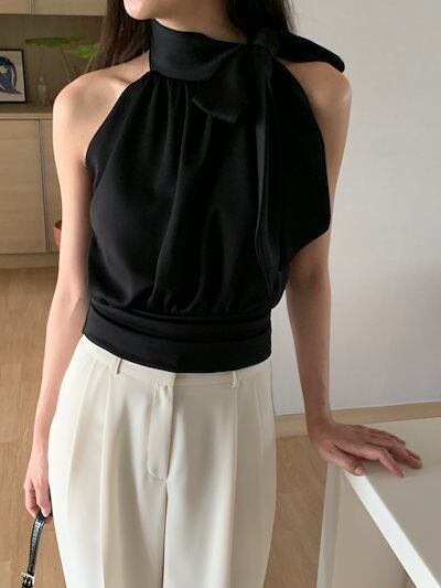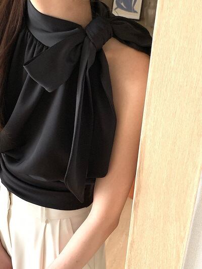 2024 夏 韓国トップス シャツ ホルターネック ノースリーブ リボン ゆったり 細見え 夏 白 黒 紫 おしゃれ かわいい 韓国ファッション レディース お出かけ