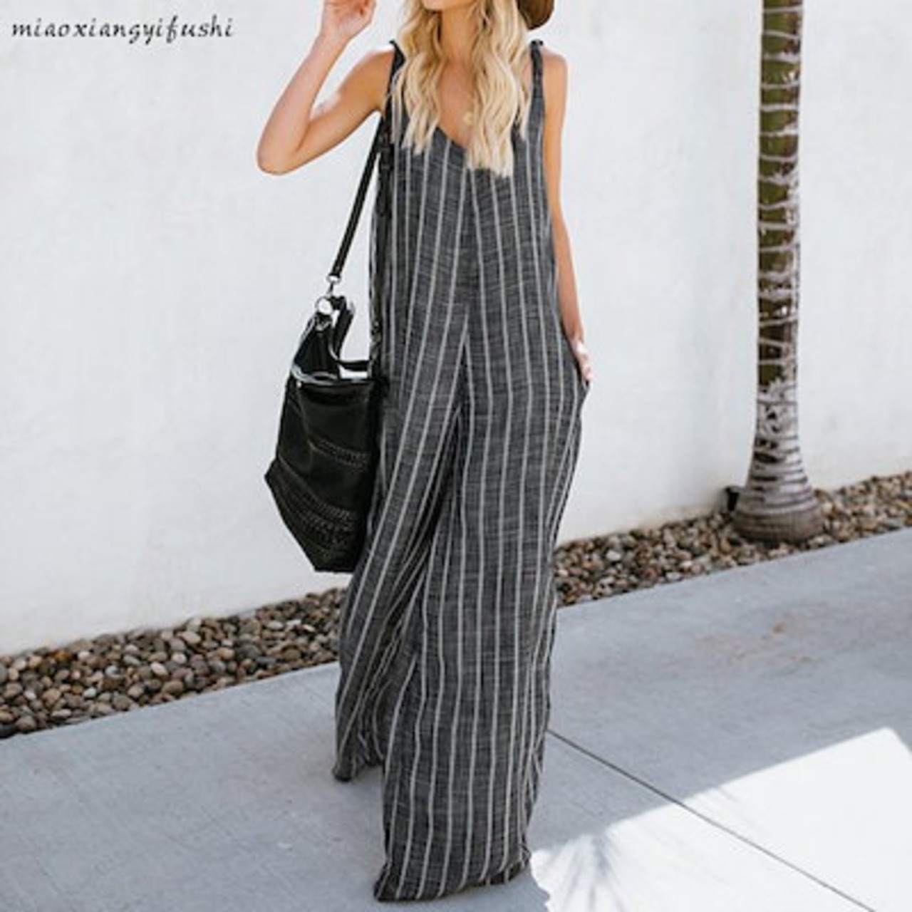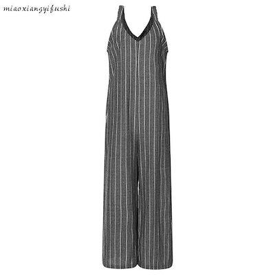 サロペット レディース オーバーオール マキシ丈 ロング丈 ボトムス ストライプ柄 着痩せ ガウチョ326313132