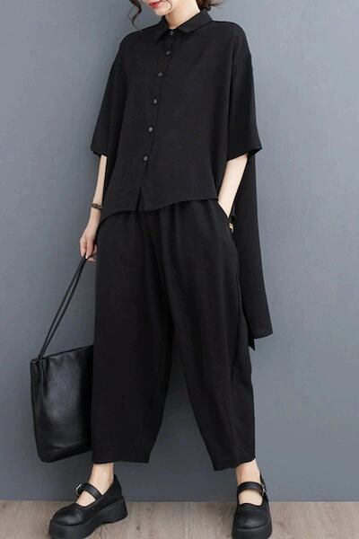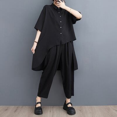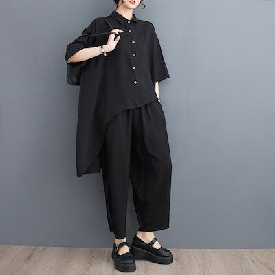 【お勧め商品】「ファットガール」ブラウス+7分丈パンツ 夏 上下セット お尻すぽっり 体型カバー 着痩せ ゆったり 大きいサイズ セットアップ ママスーツ ジャージ 卒業式 人気 メガ割