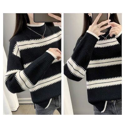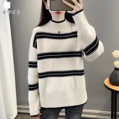 セーター レディース サイドスリットボーダーセーター タートルネック ゆる ざっくり かわいい 厚手 ケーブル編み トレーナー 人気 白 黒 ブランド 柄 ハイネック ニットセーター 春 クルーネック | OPEN-korea
