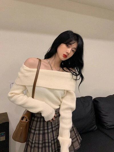 ニットセーター オフショルダー オフショルニット 春秋風 長袖 ドロップショルダー レディース 大人 レースアップ フェミニン 可愛い ざっくり編み リブニット タイト ショート丈 ゆったり オフホワ | OPEN-korea