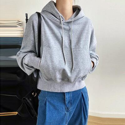 トレーナー レディース フード付き ショート丈 パーカー カジュアル 春 秋 冬 長袖 厚手 裏ボア ゆったり 着痩せ 韓国 ファッション おしゃれ へそ出し 細見せ 20代 30代 パフスリーブ | OPEN-korea