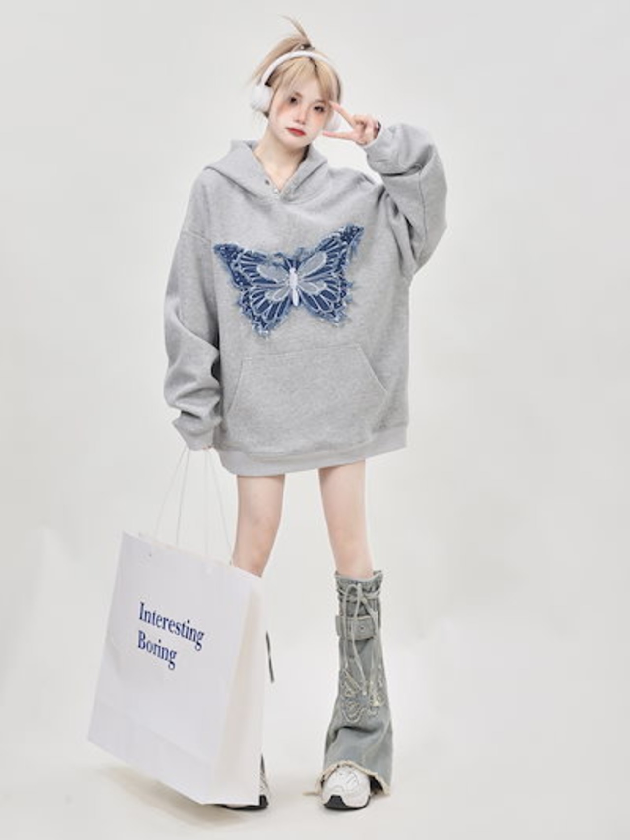アメリカ式重ポンド小人数デザイン感刺繍蝶グレーの連帽衛衣女2024新型爆金ゆったり上着春モデル