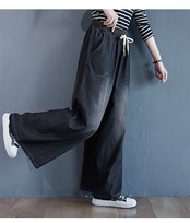 「ファットガール」 秋冬 デニムパンツ ゴム ワイドパンツ ハイウエスト 大きいサイズ ゆったり フレア レディース ロングパンツ