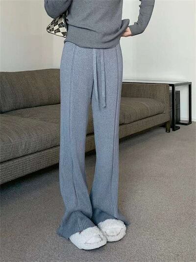 きれいめ 秋 フレア レディース ワイド 秋冬 ニット 冬 ニットパンツ ロング リブ 新品 ボトムス 厚手 パンツ タックパンツ 暖かい スリットパンツ ゴム カジュアル ロングパンツ ハイウエスト | OPEN-korea