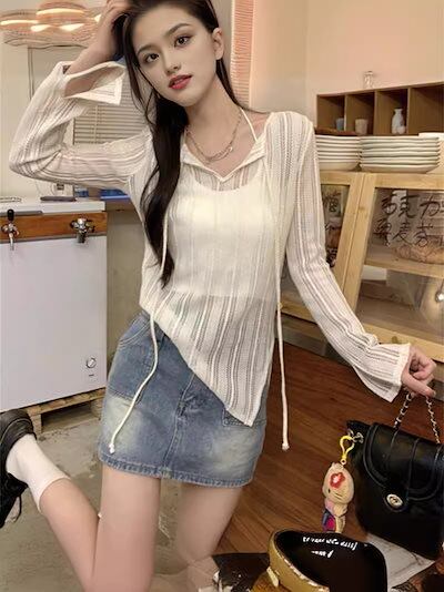 UVカット レディース ブラウス着 夏 韓国版 ゆとりがある 長袖ニット 薄手の上着 アウター パーカー 体型カバー 紫外線対策