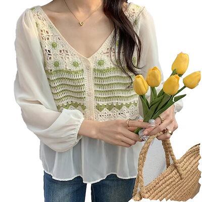 今っぽシアーシャツ レディースシャツ 春秋の新作 韓国ファッション 日焼け止め ニット 長袖 偽2件 シフォンの上着