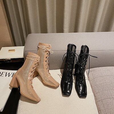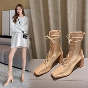 2023年新作2colorサマー夏ファッションサンダルメッシュブーツ 女性用 pu 太いハイヒール7.5cmショート丈ブーツレディース 美脚 通気 夏作疲れない