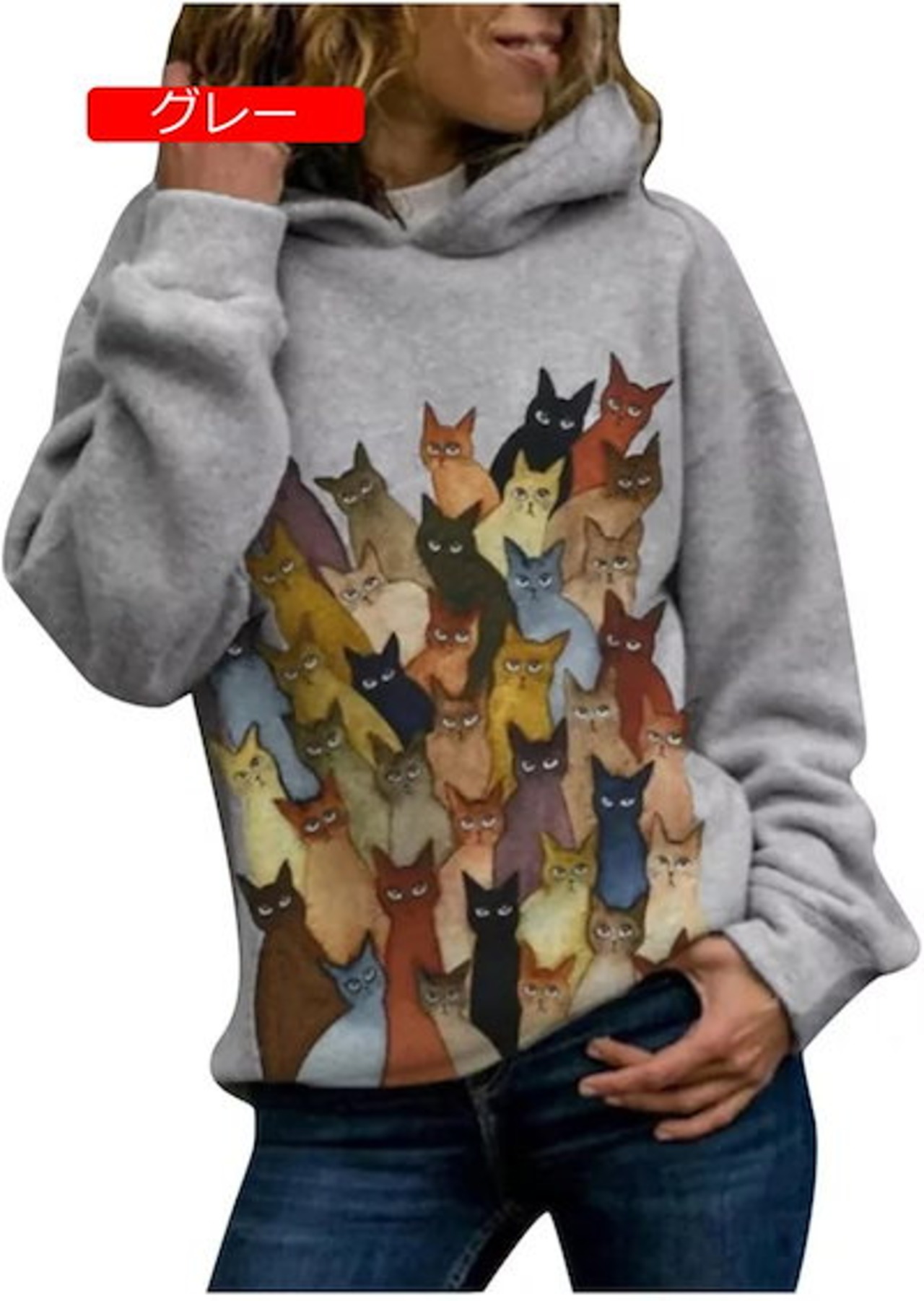パーカー トレーナー メンズ レディース ねこ柄 可愛い カラフル 長袖 フード付き カジュアル シンプル ハンサム 丈長め ビッグシルエット 丸襟 体型パカー トップス プルオーバー 柔らかい オシ | OPEN-korea