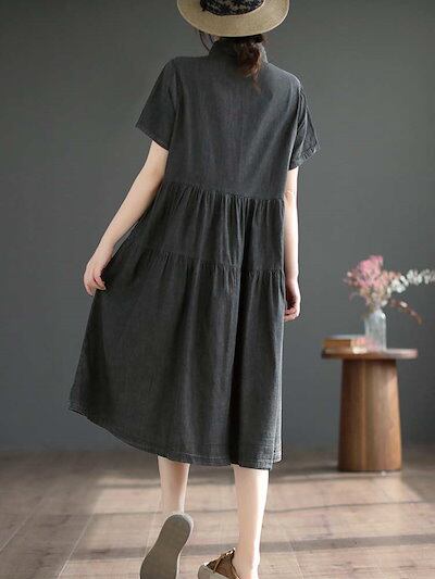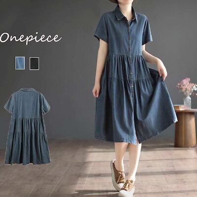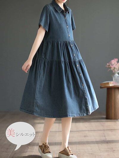 デニムワンピース レディース ロング シャツワンピース 半袖 デニム 春夏 秋 ロングワンピース Aライン 体型カバー ゆったり シンプル ロングワンピ かわいい 春 夏 大きいサイズ カジュアル ワ | OPEN-korea