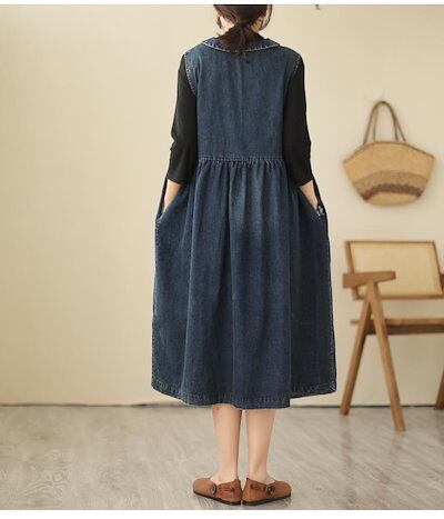 ジャンパースカート デニム レディース デニムワンピース ノースリーブ ロング丈 vネック 襟付き ロングワンピース 無地 前開き ワンピース ポケット付き マキシワンピース ゆったり 体型カバー フ | OPEN-korea
