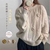 ケーブル編み 花刺繍ニット セーター レディース 秋冬 長袖 ニット花刺繍 ニット セーター トップス ラウンドネック ニットトップス ゆったり カットソー ニットウェア 大人可愛い 無地 送料無料 | OPEN-korea