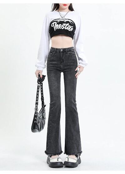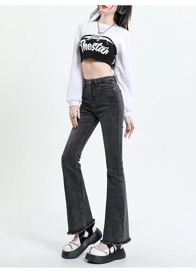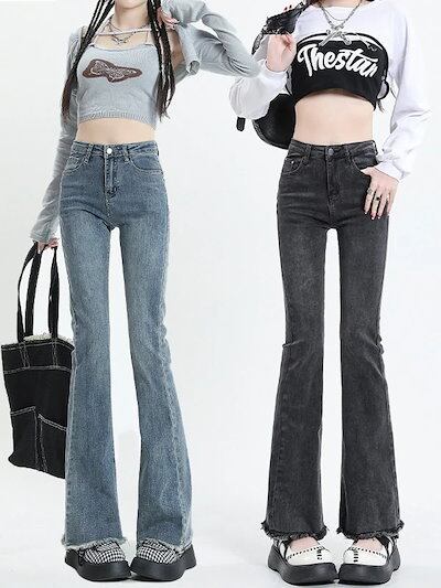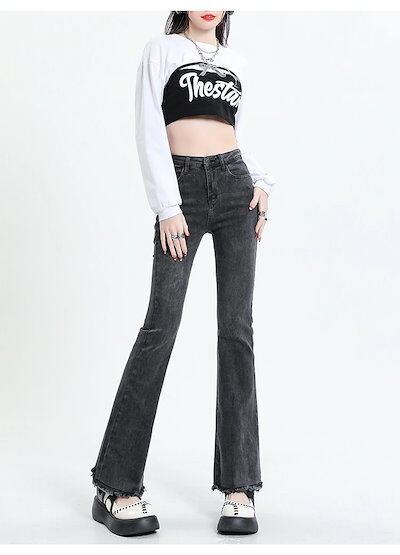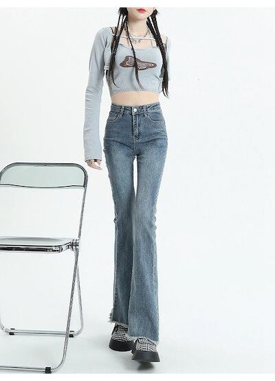 韓国ファッション レディース ストレッチ 着痩せ ボトムス カジュアル きれいめ ワイドジーンズ フルレングス ハイウエスト スリット ブーツカット デニム・ジーンズ 三色[5タイプ] | OPEN-korea