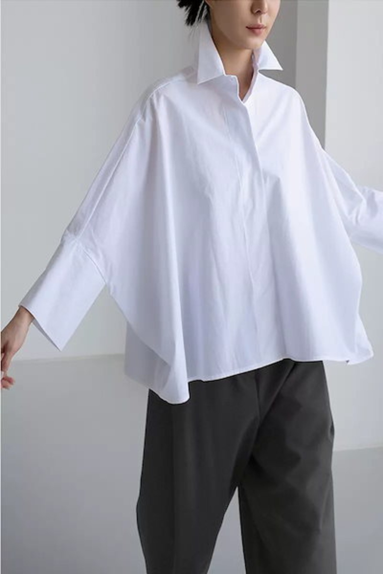 ドルマンシャツ シャツ レディース トップス 長袖 ブラウス 綿 無地 大きいサイズ チュニック きれいめ 羽織り シンプル ゆったり 襟付き 襟 前開き ドルマン ドルマンスリーブ ドロップショル | OPEN-korea