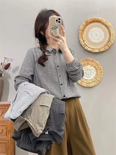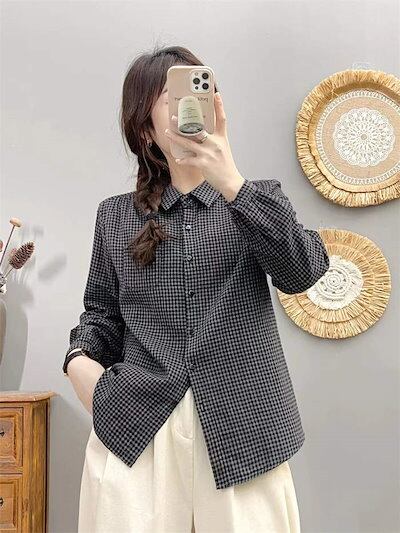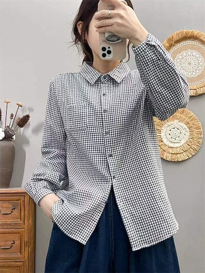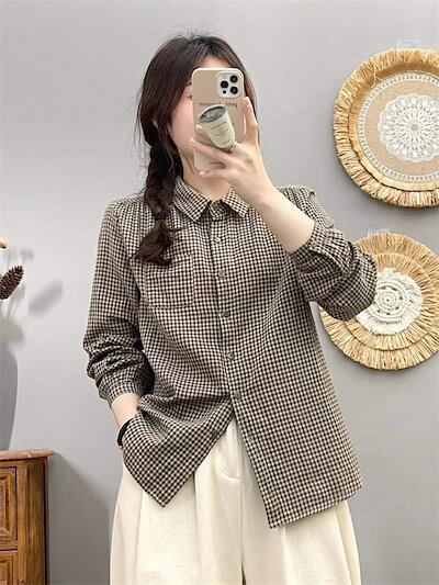 シャツ レディー 長袖 ダブルガーゼス チェック柄 綿 ブラウス 入学式 トップス オフィス 長袖 折り襟 春秋 おしゃれ ゆったり きれいめ カジュアル 体型カバー お呼ばれ 通勤 通学 卒業式 卒 | OPEN-korea