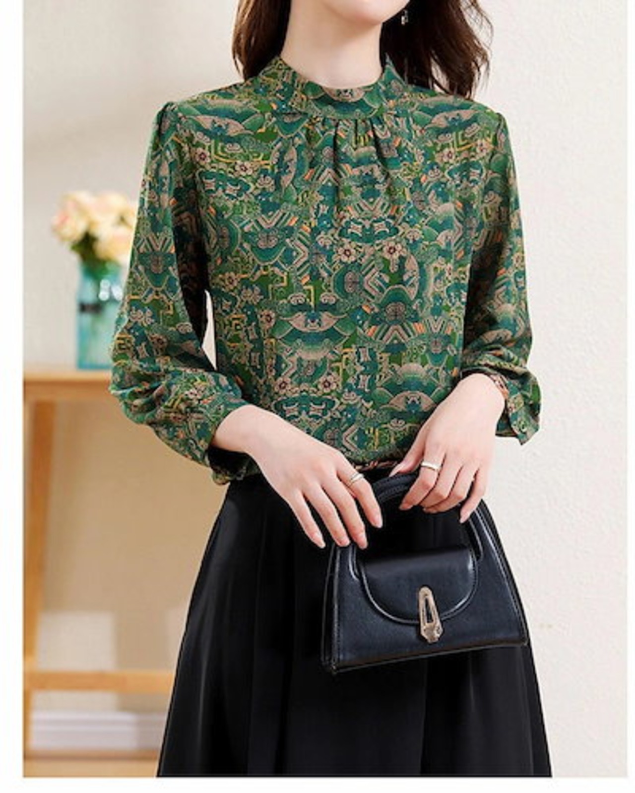 ブラウス 長袖 レディース 総柄 ハイネック シャツブラウス 立ち襟 ギャザー トップス ゆったり 大きいサイズ 春夏秋 大人可愛い きれいめ 大人 おしゃれ ゆる感 森ガール プリント ファッション | OPEN-korea