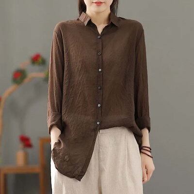 綿麻シャツ ロングシャツ レディース 長袖 綿麻 体型カバー 襟 リネン ボタン付き トップス ゆったり カジュアル ブラウス 長め OL 着痩せ 無地 春秋 20代 30代 40代 50代 | OPEN-korea