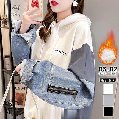 パーカー レディース 大きめ 裏起毛 暖かい デニム切り替え おしゃれ オーバーサイズ トップス 長袖 切り替え デニム スウェットフード付きトレーナー 大きい
