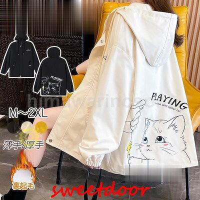 パーカー レディース 長袖 秋 冬 トップス プルオーバー ゆったり 猫柄 おしゃれ フード付き ジップアップ 羽織 アウター 薄地 裏起毛 厚手 防寒 保温 新作