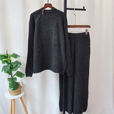 セットアップ トップス パンツ レディース 秋 冬 ニット 長袖 ハイネック 立ち襟 上下セット 大きいサイズ パンツセット プルオーバー ワイドパンツ ロング ロングパンツ ケーブル編み ケーブルニ | OPEN-korea