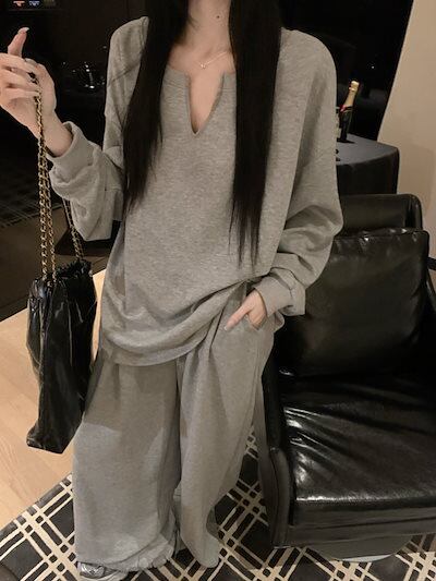 2024 秋冬 韓国 かわいい レディース 無地 Vネック長袖トップスレトロセットアップ黑白パーカーブルサイズ丈春カジュアルスポーツファッション系通学学生袖お出かけアップシルエットトラック | OPEN-korea