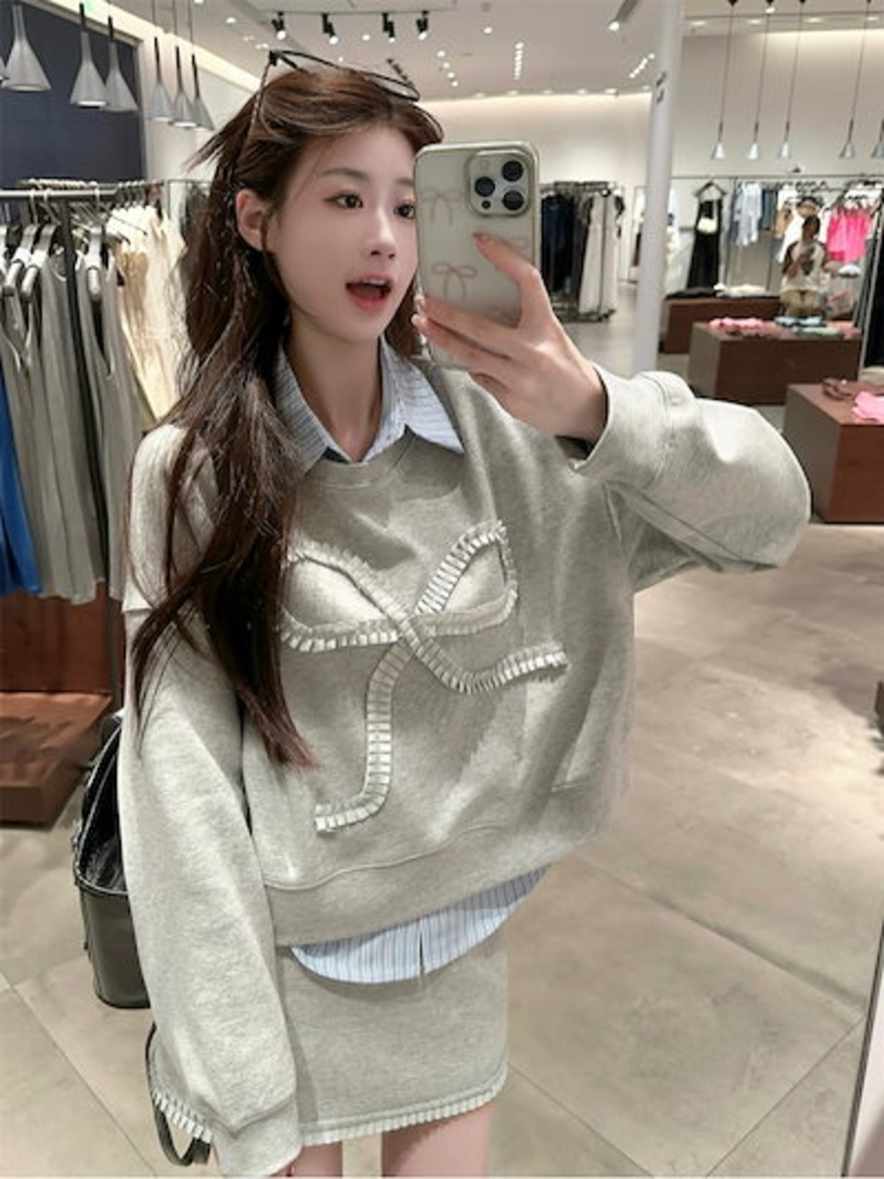 2024 秋冬 韓国 かわいい レディース 無地 ショート長袖トップスレトロセットアップ黑白パーカーミニサイズ丈春カジュアルスポーツファッション系通学学生袖お出かけアップシルエットトラック羽織り上下 | OPEN-korea
