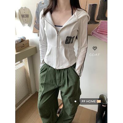 2024 秋冬トップスかわいいパーカーフード付き韓国風長袖ゆったり細見え白黒おしゃれレトロチャッシルエット甘め大人っぽ韓国ダブルサイズファッション系ルーズレディースサイドお出かけ学生通学トラック羽織り | OPEN-korea