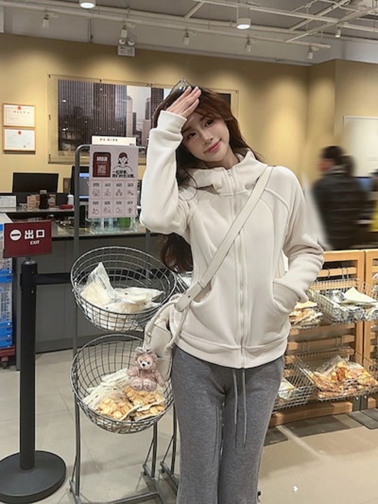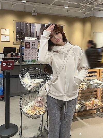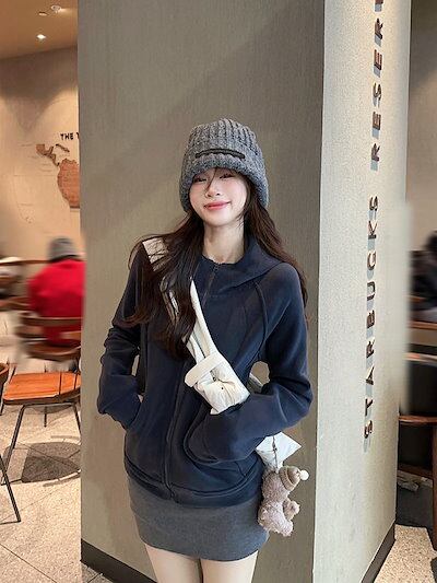 2024 秋冬トップスかわいいパーカー裹起毛フード付き韓国風長袖ゆったり細見え白黒おしゃれレトロチャッシルエット甘め大人っぽ韓国フルサイズファッション系ルーズレディースお出かけ学生通学トラック羽織り | OPEN-korea