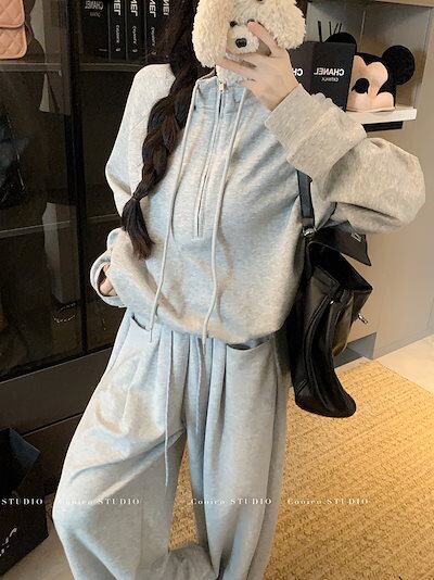 2024 秋冬 韓国 かわいい レディース 無地ハイネック長袖アウターレトロセット黑白フーディーハーフサイズ丈トップス春カジュアルスポーツファッション系通学学生袖お出かけアップシルエットトラック羽織 | OPEN-korea