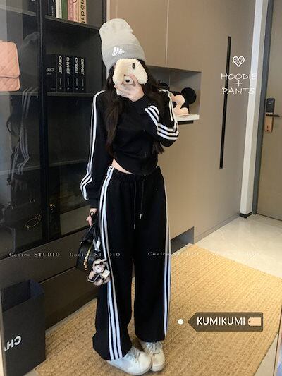 2024 秋冬 韓国 かわいい レディース無地フード付き長袖アウターレトロセット黑白フーディーブルサイズ丈トップス春カジュアルスポーツファッション系通学学生袖お出かけアップシルエットトラック羽織り上下 | OPEN-korea