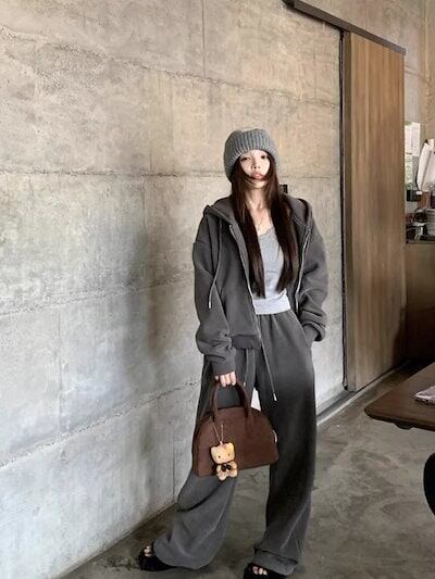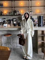2024秋冬 韓国 かわいい レディース 無地 フード付き長袖アウターレトロセット黑白フーディーダブルサイズ丈トップス春カジュアルスポーツファッション系通学学生袖お出かけアップシルエットトラック羽織り | OPEN-korea