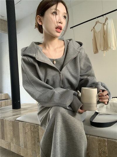 2024 秋冬 韓国 かわいい レディース無地 フード付き長袖アウターレトロセットフーディーダブルサイズ丈トップス春カジュアルスポーツファッション系通学学生袖お出かけアップシルエットトラック羽織り上下 | OPEN-korea