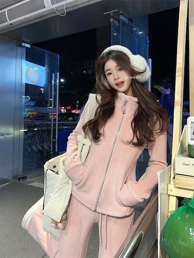 2024 秋冬 韓国 かわいい レディース 無地 フード付き長袖アウターレトロセット黑白フーディーブル丈トップス春カジュアルスポーツファッション系通学学生袖お出かけアップトラック羽織り | OPEN-korea