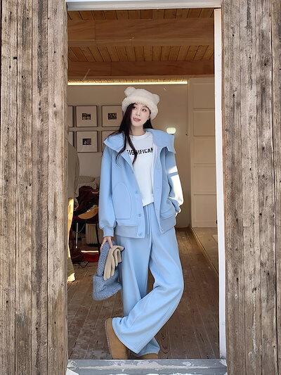 2024 秋冬 韓国 かわいい レディース 無地 ハイネック長袖アウターレトロセット黑白フーディーブルサイズ丈トップス春カジュアルスポーツファッション系通学学生袖お出かけアップシルエットトラック | OPEN-korea