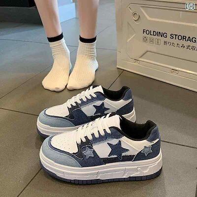 レディース デニムキャンバス スター スニーカー 春秋 厚底 カジュアル スポーツ レジャー アウトドア ホワイト シューズ