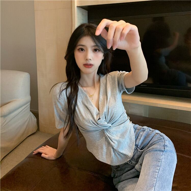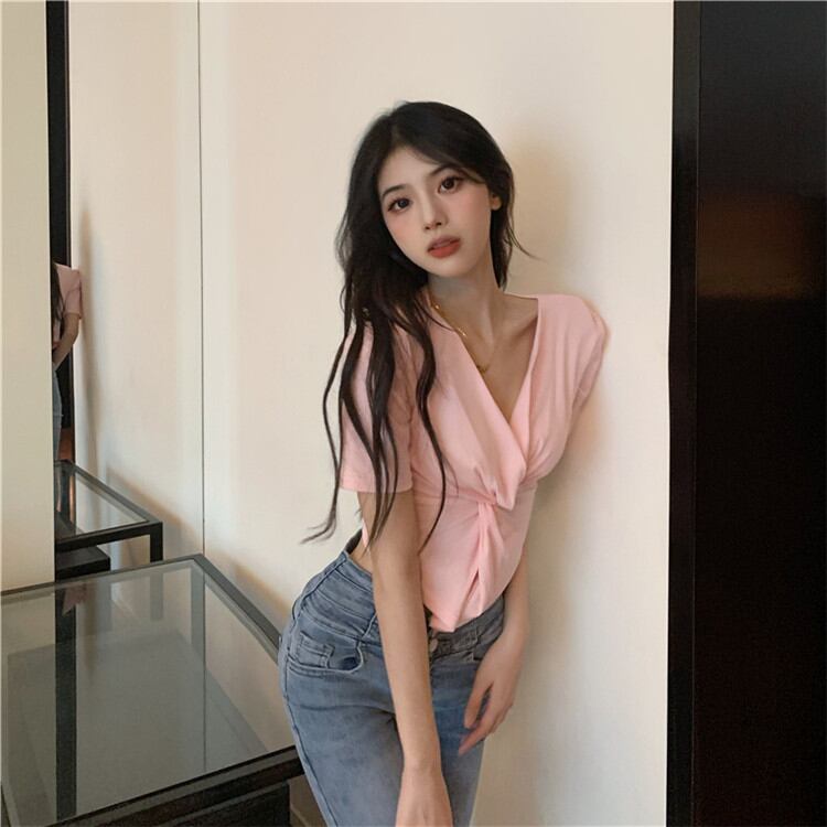 夏 新作 Vネック 半袖 トップス スリムフィット 交差する フォールド 短いスタイル