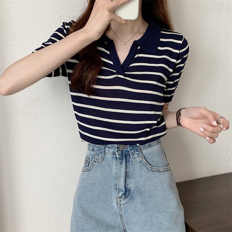 体型カバーに効く 早い者勝ち ニット ストライプ Tシャツ レディース 半袖 夏 Vネック トップス