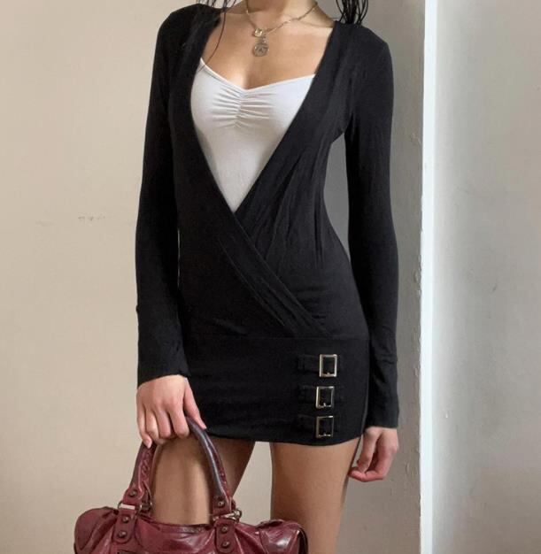 2024春秋新作 女 レディース ハイウエスト 長袖 ニット ミニ ワンピース ドレス タイトスカート