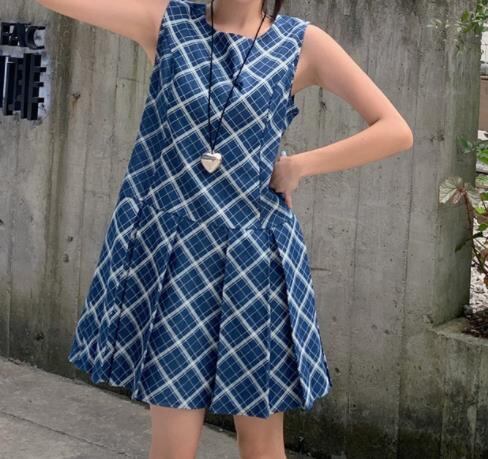 2024春夏新作 女 レディース ハイウエスト 袖なし チェック柄 ミニ ワンピース ドレス 台型スカート